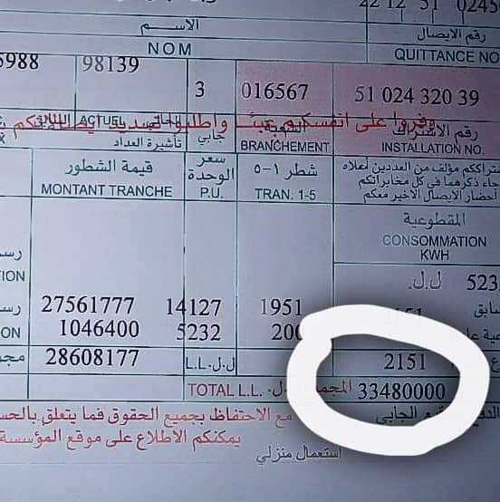 ويختم “نبيع الكيلوواط لشركة كهرباء لبنان بسعر 60 ليرة، وتبيع هي الكمية نفسها بسعر 10 سنتات، و27 سنتا لكل كيلوواط بعد تجاوز المئة. ويُمكن استعراض هذه الظاهرة من خلال الفاتورة التي تم تداولها على وسائل التواصل الاجتماعي، والتي بلغت قيمتها 33 مليون ليرة و800 ألف ليرة لـ2151 كيلوواط. وفي حال دفعت لنا كهرباء لبنان ما يعادل 3 كيلوواط فقط، ستدفع لنا 129 ألف ليرة، وبالتالي فالمبلغ المتبقي سيكون ربحًا لها”.